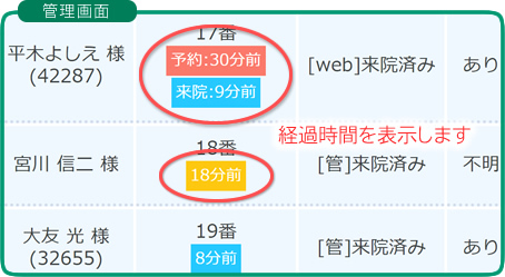 この経過時間は管理画面に表示され、患者様側の予約画面には表示されません。