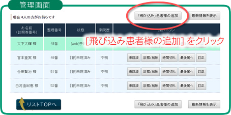 あとは通常の予約患者様と同様に、当該患者様がクリニック窓口に来られたら[来院済]ボタンをクリックし、診察室へお呼びしたら[診察/削除]ボタンをクリックします。