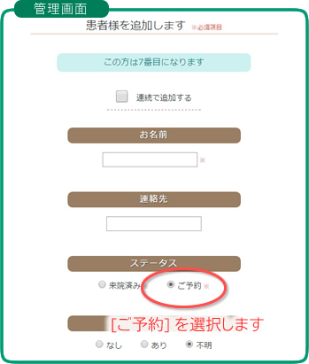 飛び込み患者様の追加画面です。飛び込み患者様の追加時と同様にお名前などを入力しますが、今回は [ステータス:ご予約] を選択します。 画面上部には「この方は7番目になります」と表示されていますので、待ち時間もすぐに計算することができます。