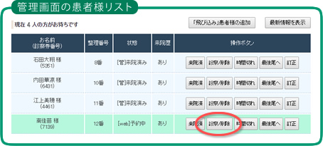 予約キャンセルにつきましても、ご予約時に患者様ごとに発行されるマイページから、患者様ご自身でキャンセルしていただくことが可能ですが、予約キャンセルのお電話があった場合は、クリニック様側で予約システム管理画面内の患者様リストの当該患者様の[診察/削除]をクリックしていただければ、当該患者様の削除=予約キャンセルとなります。