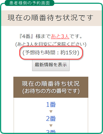 その後患者様が予約を完了されますと、その患者様専用のページが発行されますので、そのページ内では、その患者様の順番までの予想待ち時間が表示されるようになります。つまり、予約患者様の順番が近づくのと連動して、予想待ち時間も短くなっていきます。